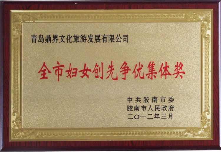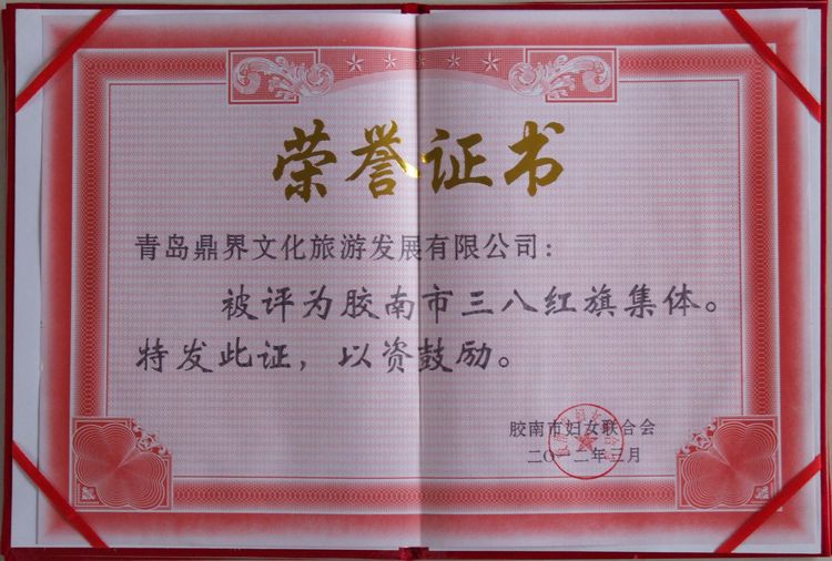 3月7日,全市紀念“三八”國際勞動婦女節(jié)102周年大會隆重召開。大會授予青島鼎界文化旅游發(fā)展有限公司“全市婦女創(chuàng)先爭優(yōu)集體獎”和“膠南市三八紅旗集體”榮譽稱號。