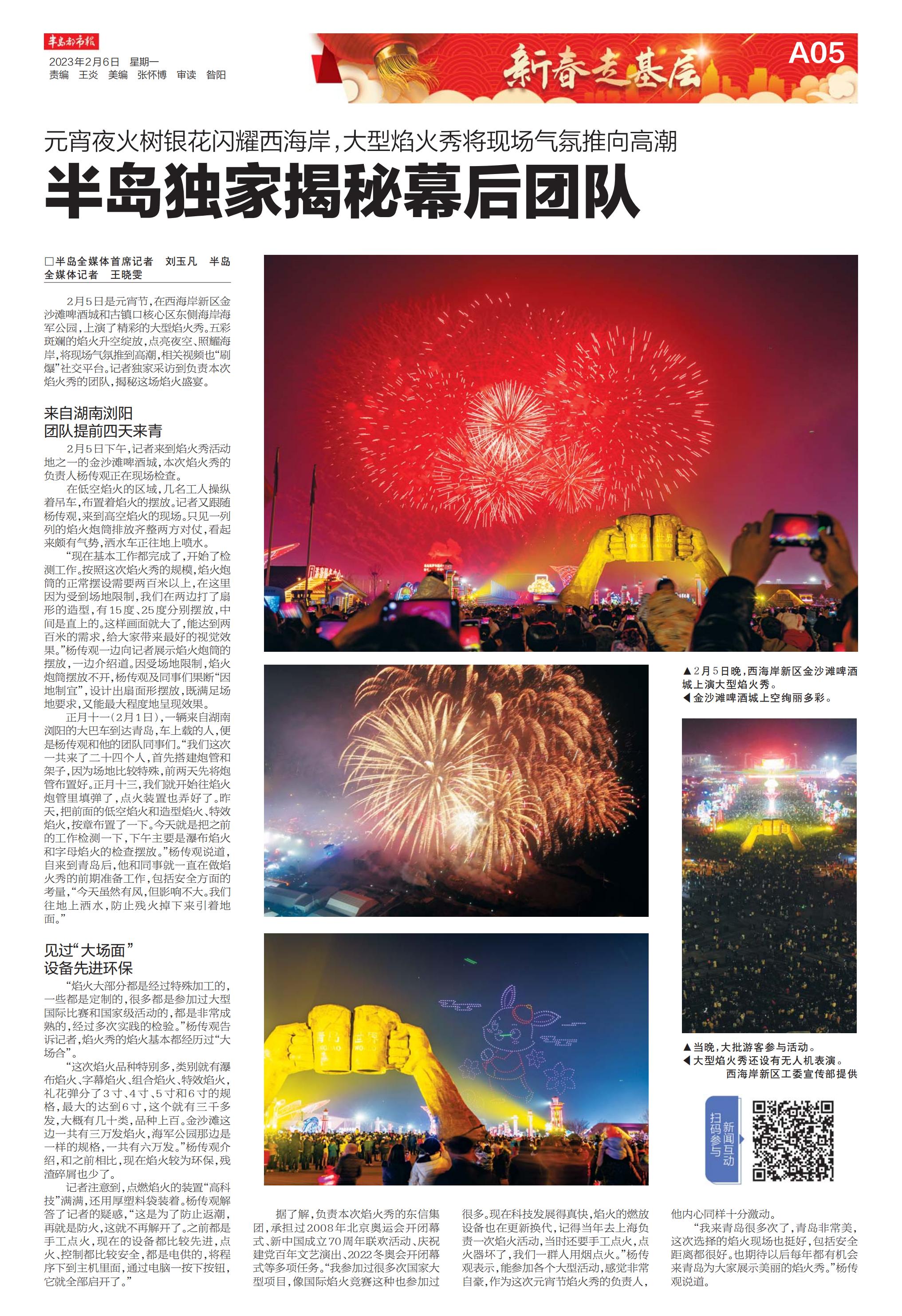 2月5日是元宵節(jié),在西海岸新區(qū)金沙灘啤酒城和古鎮(zhèn)口核心區(qū)東側(cè)海岸海軍公園,上演了精彩的大型焰火秀。五彩斑斕的焰火升空綻放,點(diǎn)亮夜空、照耀海岸,將現(xiàn)場(chǎng)氣氛推到高潮,相關(guān)視頻也“刷爆”社交平臺(tái)。記者獨(dú)家采訪到負(fù)責(zé)本次焰火秀的團(tuán)隊(duì),揭秘這場(chǎng)焰火盛宴。