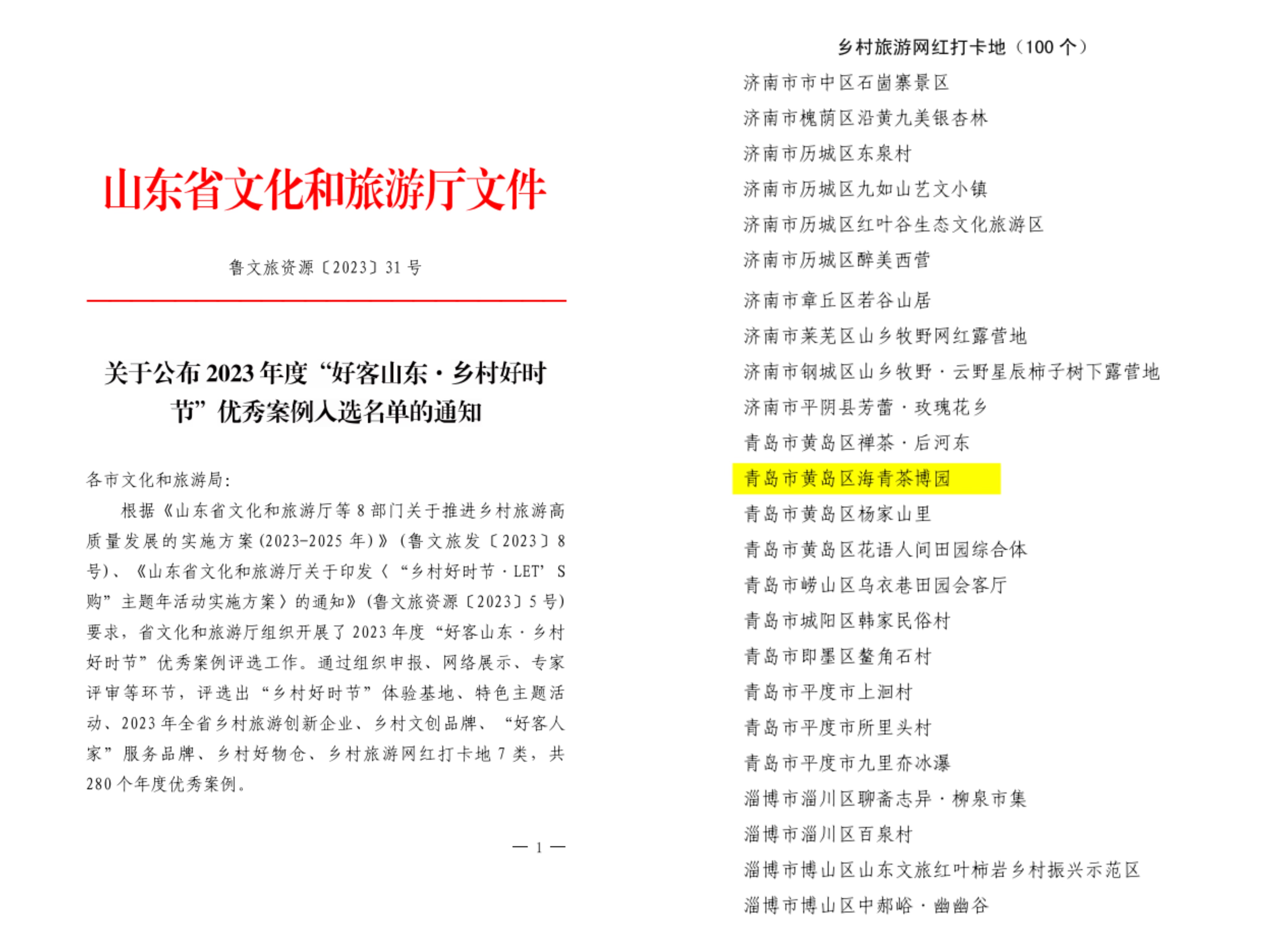 近日,山東省文化和旅游廳公布了2023年度“好客山東·鄉(xiāng)村好時節(jié)”優(yōu)秀案例入選名單,海青茶博園榜上有名,成為100個鄉(xiāng)村旅游網(wǎng)紅打卡地之一!